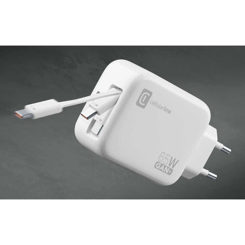 • Vgrajen sistem za navijanje kabla: Cellularline ROLLER 65W prinaša revolucijo v svet polnjenja. Pozabite na dolge, prepletene kable v torbi ali na pisalni mizi. Polnilnik ima integriran USB-C kabel, ki ga preprosto izvlečete do želene dolžine, po uporabi pa se z enim potegom varno in elegantno navije nazaj v ohišje.